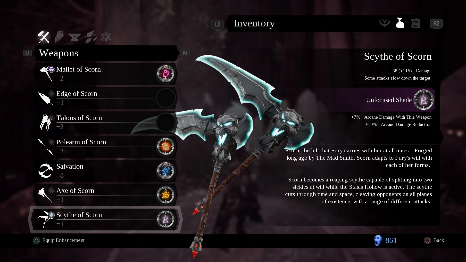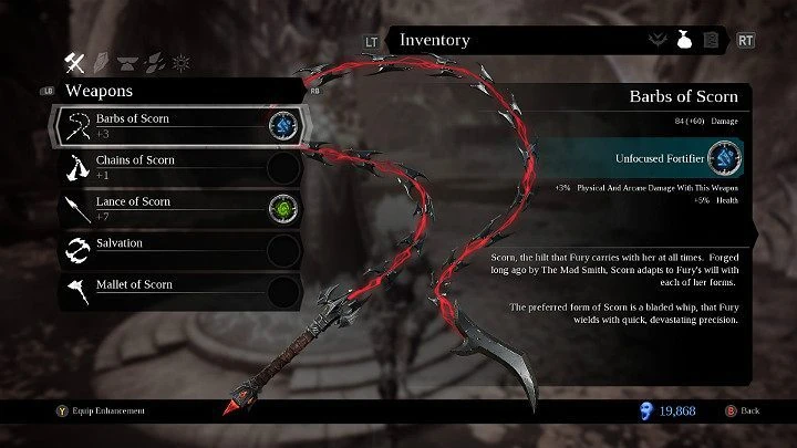 Scorn is the personal weapon of the horseman Fury. It gained many new forms on Fury's journey to destroy the Seven Deadly Sins, on account of the Lord of the Hollows giving Fury the power of his Hollows. In all of its forms, Fury would regularly take them to Ulthane, the Maker, to upgrade using Adamantine.