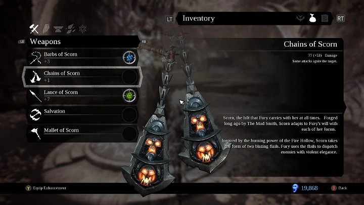 Chains of Scorn | The second form of Scorn, this form resembles a pair of bladed chains. Fury acquired this form when the Lord of the Hollows gave her the Flame Hollow. The Chains of Scorn would deal repeating fire damage. |