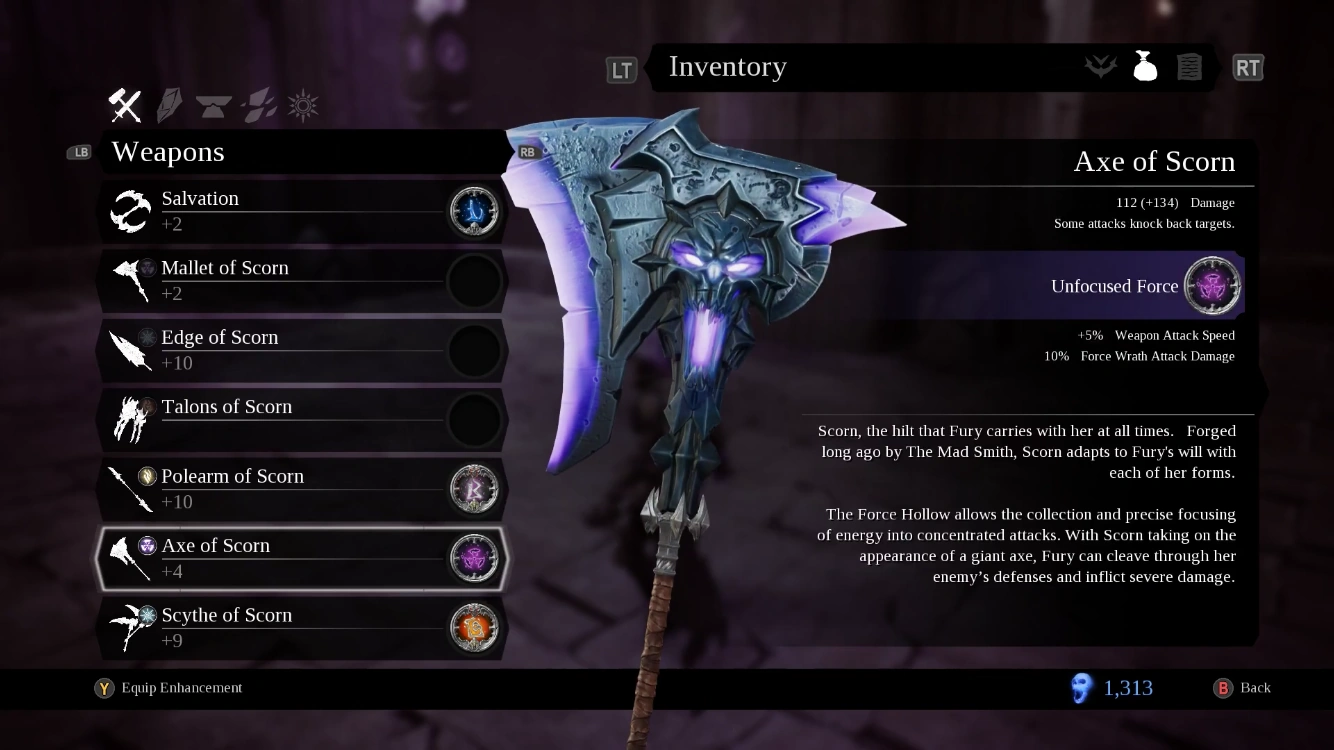 Axe of Scorn | The Eighth form of Scorn. After Roarakk was destroyed the Keepers's power reacted to the Force Hollow and birthed a new weapon in the form of a pitiless battle axe able to be swung faster to chop Fury's enemies in sweeping arcs. |