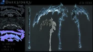 The Harvester is a shapeshifting weapon, much like Fury's Scorn in Darksiders 3. It is able to take on many forms if Death wills it such as the main single scythe form, dual scythes, gauntlets, hammers, and more (in the novel "Darksiders the Abomination Vault" Death even used The Harvester as a grapple hook, catching him as he fell off a cliff; on another occasion, when Death was pinned under heavy rubble, he used the shapshifitng blade to lift the rubble by changing its shape while under it). The Harvester's "true form," or base form, is that of a giant scythe with skulls of the damned down the sides of the blade (much like War's Chaoseater)... though in Darksiders 1 the blade appeared as a demonic wing shape blade while in War's possesion.